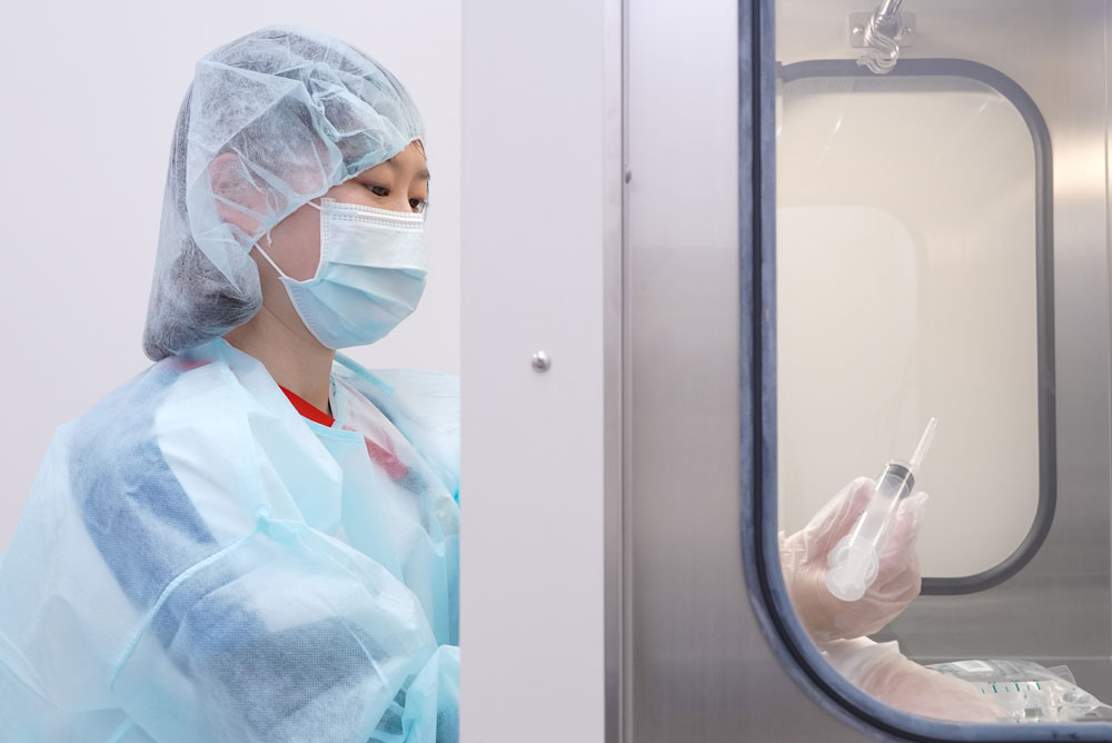 注射処方箋をもとに、患者様、一人一人のデータを薬剤科内のコンピューターに入力します。更に点滴ラベルを発行し、注射処方箋をもとに翌日分の記載内容、処方薬の配合上の問題、安定性、投与方法などをチェックしながら、個人別1施用毎に調剤しています。高カロリー輸液の無菌調製、カリウム製剤の混注も、全て薬剤科内のクリーンベンチにて行っています。